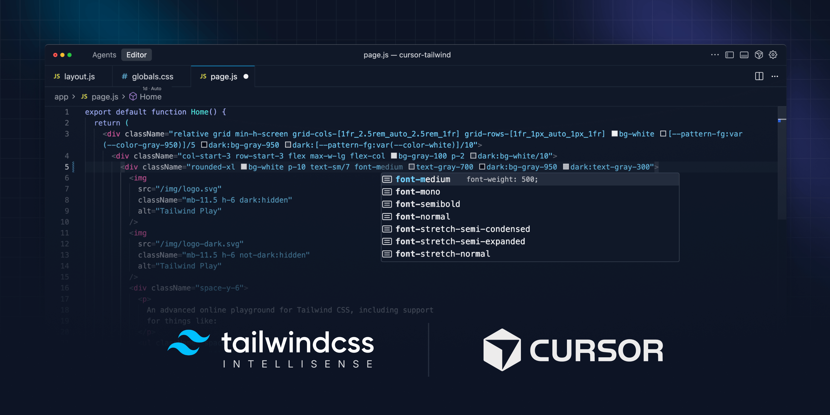 Cursor 是一款原生 AI 程式碼編輯器,具有情境感知自動完成和內建編碼代理等功能。由於它支援 VS Code 擴充功能,你熟悉的所有 Tailwind CSS 工具都可以直接使用——包括我們的官方 Tailwind CSS IntelliSense 擴充功能和用於類別排序的 Prettier 外掛。